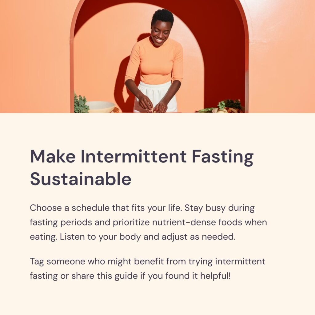 Remember: Intermittent fasting is a journey, not a race. Start slow, stay consistent, and adjust your approach as needed for sustainable success.