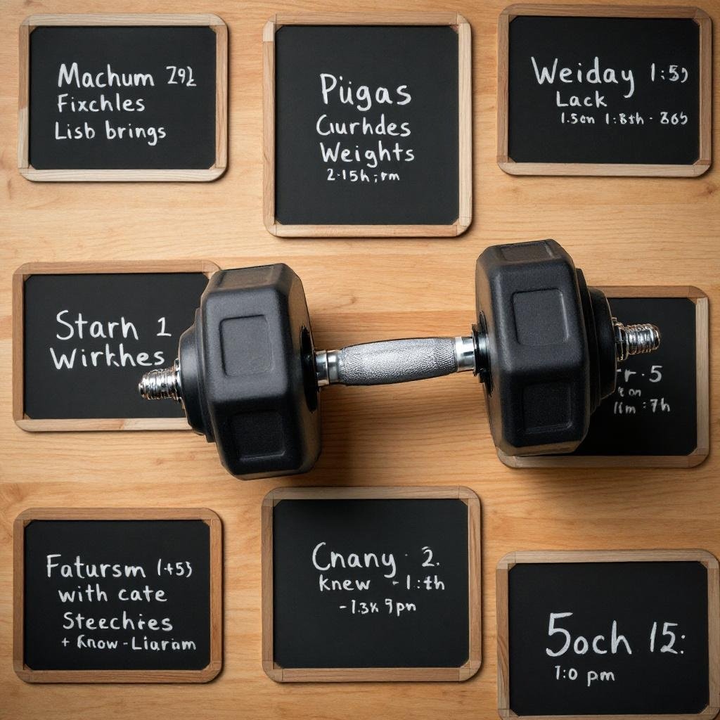 - Day 1: 10-minute warm-up walk, 2 sets goblet squats (10 reps), 2 sets dumbbell rows (8 reps/side), 2 sets overhead press (8 reps)