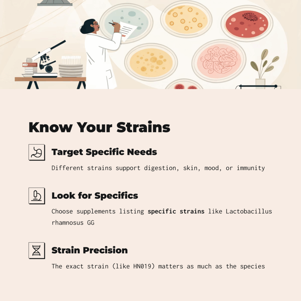 Make sure the supplement lists specific strains like Lactobacillus rhamnosus GG or Bifidobacterium lactis HN019.