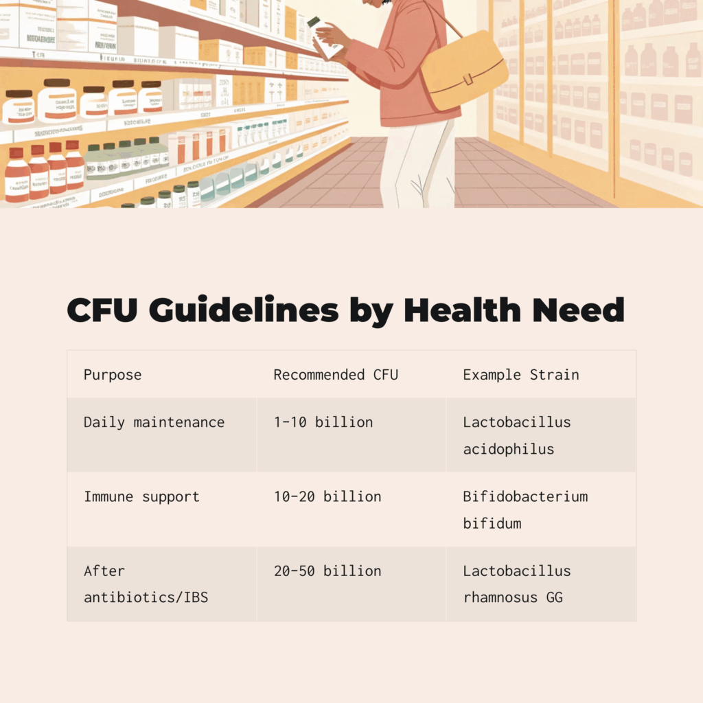 For targeted support (like IBS or after antibiotics), consider 20 billion CFU or higher.