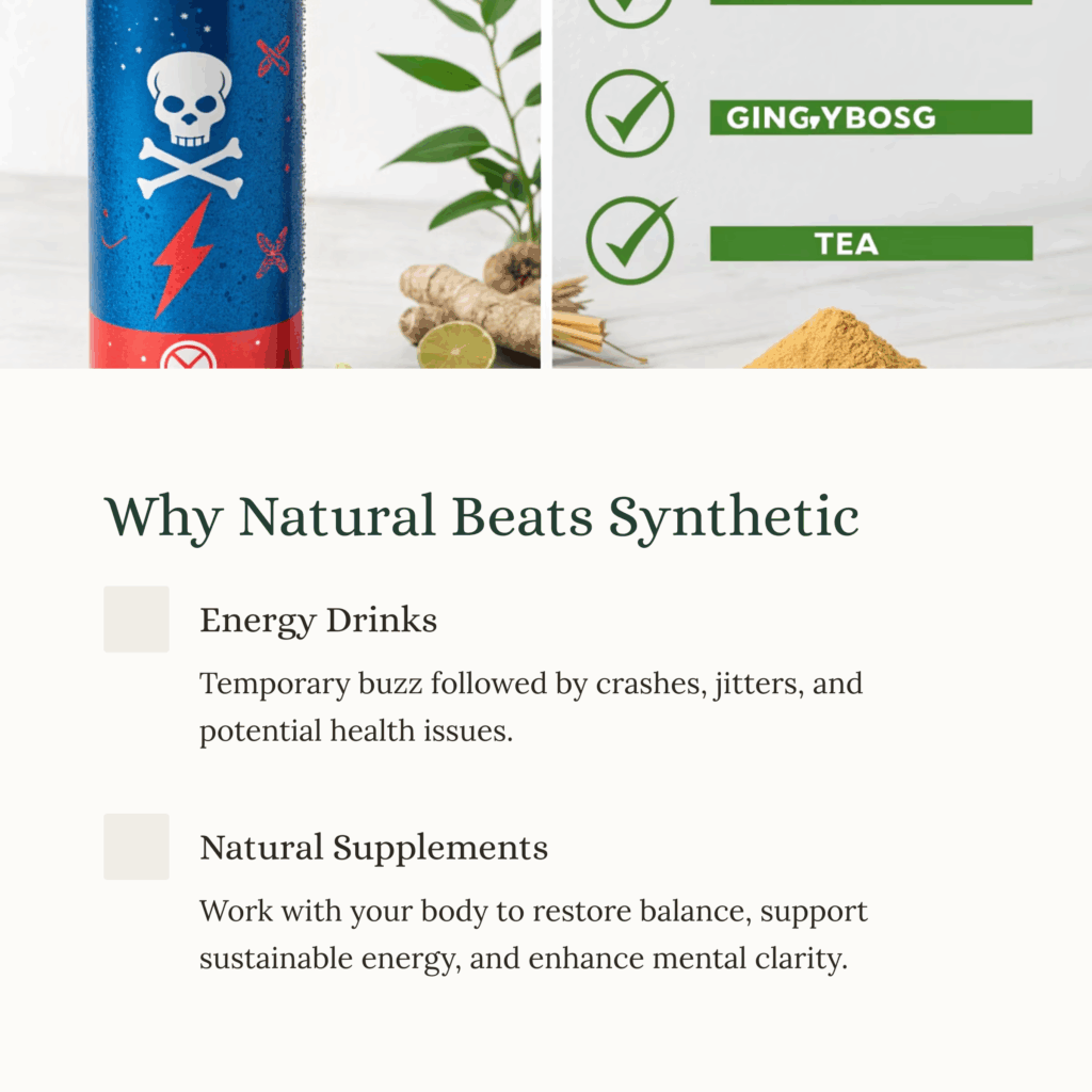 While energy drinks offer an immediate burst, they often come with a price: jittery side effects, energy crashes, and long-term health drawbacks. These supplements, on the other hand, work in harmony with your body to restore balance, support sustainable energy, and enhance mental alertness — all without the synthetic overload.