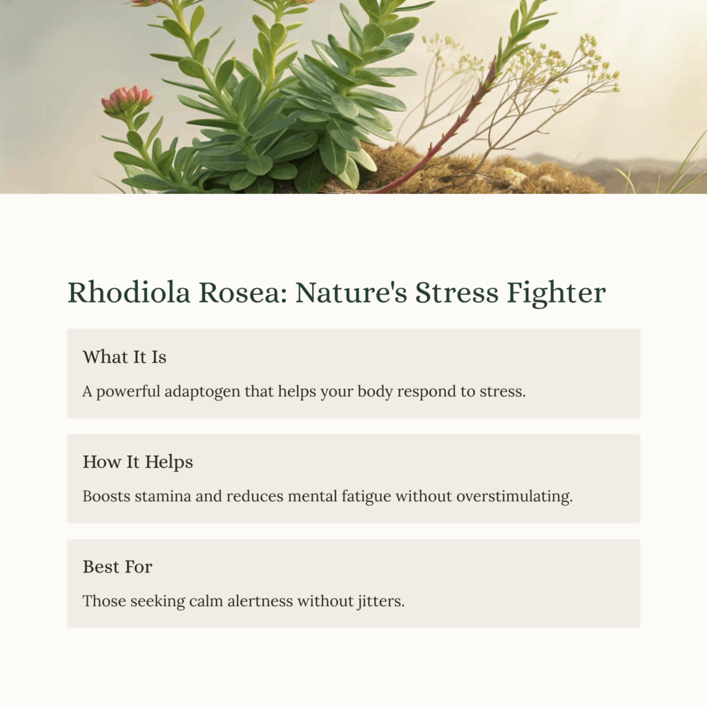 - Rhodiola Rosea – Known as nature’s adaptogen, Rhodiola helps your body adapt to stress while boosting stamina and reducing mental fatigue. It doesn’t overstimulate the nervous system, making it ideal for those seeking calm alertness.