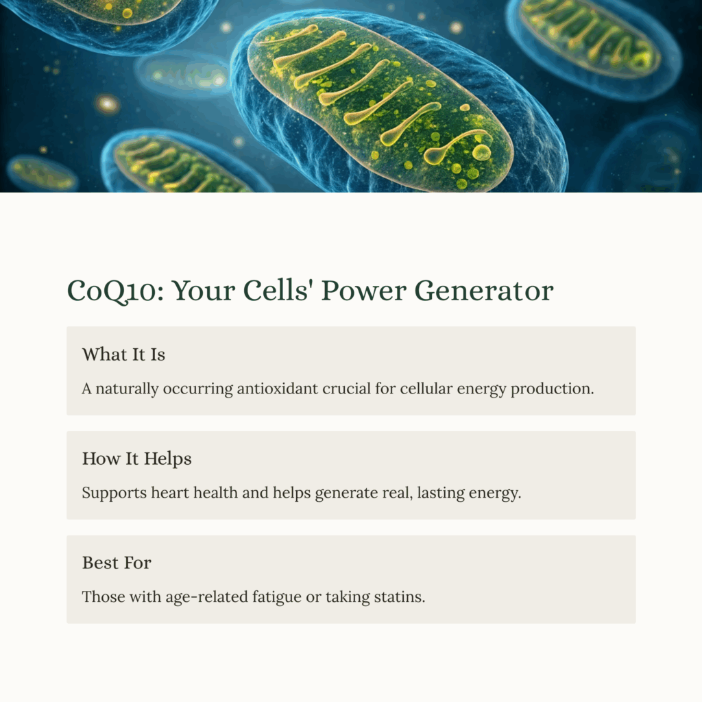 - CoQ10 – This powerful antioxidant plays a crucial role in cellular energy production. Found naturally in the body, supplementing with CoQ10 supports heart health and helps your cells generate real, lasting energy — especially important if you’re low on it due to age or statin use.