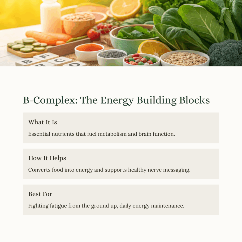 - B-Complex Vitamins – These essential nutrients are the building blocks of energy metabolism. B vitamins help break down food for fuel, support brain function, and promote healthy nerve messaging — all key factors when fighting fatigue from the ground up.